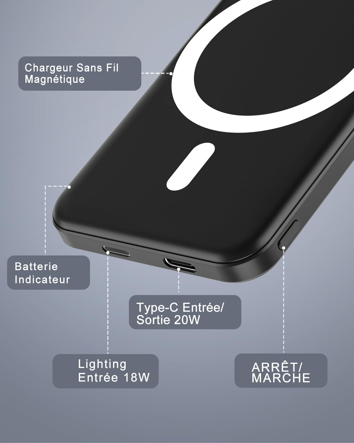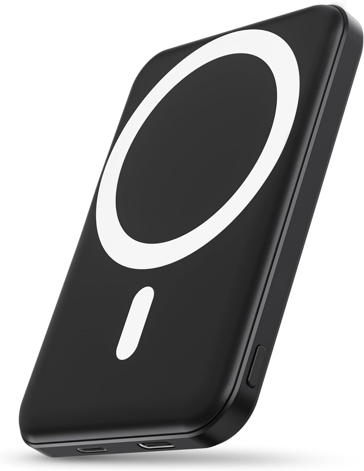 podoru for Magsafe Battery Pack, 5000mAh Magnetic Power Bank with Type-C Cable 20W PD Fast Charging Lighting Input Wireless Portable Charger for iPhone 16/15/14/13/12/ All Series-Black